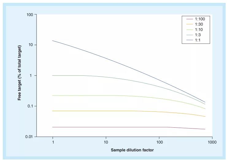 ͼ2. ÔÚ²î±ð°Ð±ê-¿¹ÌåŨ¶È±Èֵϣ¬Ñù±¾Ï¡ÊͶÔÓÎÀë°Ð±êµÄŨ¶ÈµÄÓ°Ïì¡£¼ÙÉ裺½âÀë³£Êý£¨KD£©= 0.1 nM£»Ñù±¾ÖеĴý²âÎïŨ¶ÈΪ5 nM£»¿¹ÌåÒ©ÎïµÄCDRÊÇ1-£¬3-£¬10-£¬30-»ò100-±¶ÓڰбêµÄĦ¶ûŨ¶È