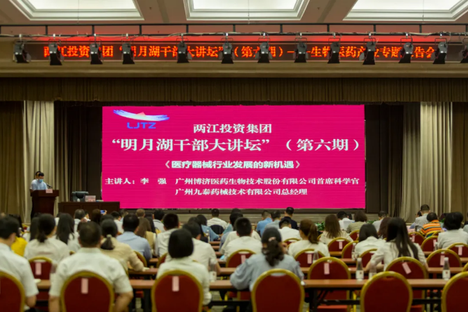 昨天(6月2日),两江投资集团第六期“明月湖干部大讲坛”在重庆举行 。beat365医药董事长王廷春,beat365医药首席科学家(医疗器械偏向)、子公司九泰药械总司理李强受邀出席此次聚会并就生物医药工业相关话题作专题报告 。